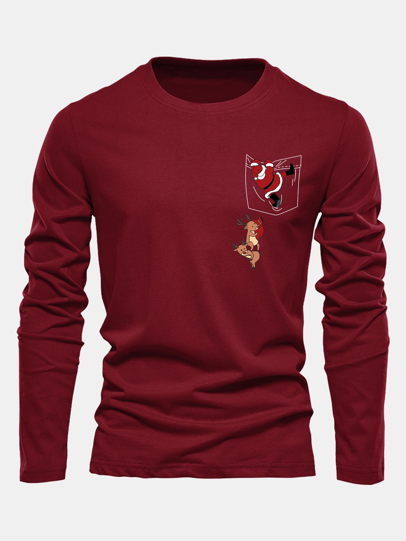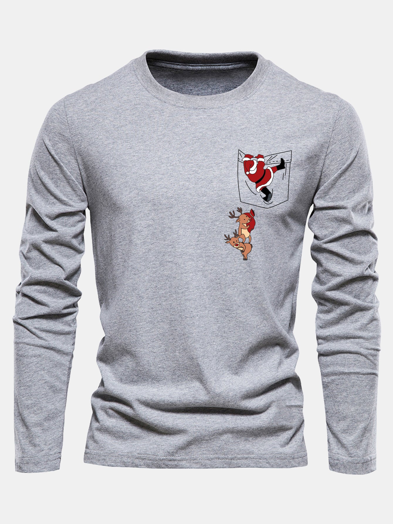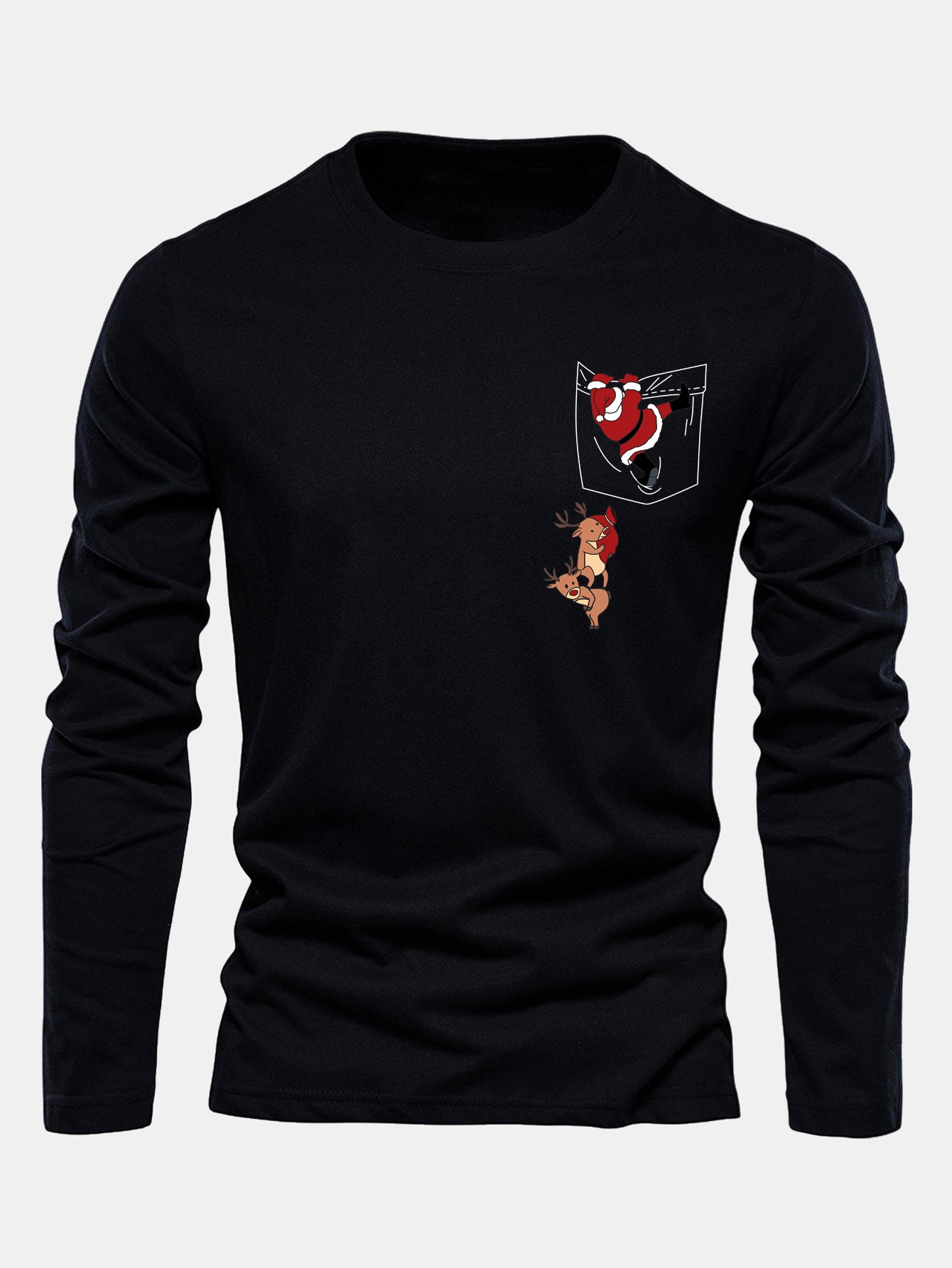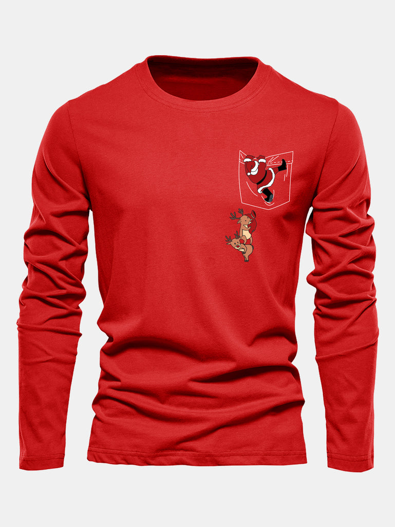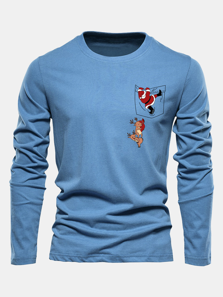Long Sleeve Pocket Santa Print Cotton T-Shirt